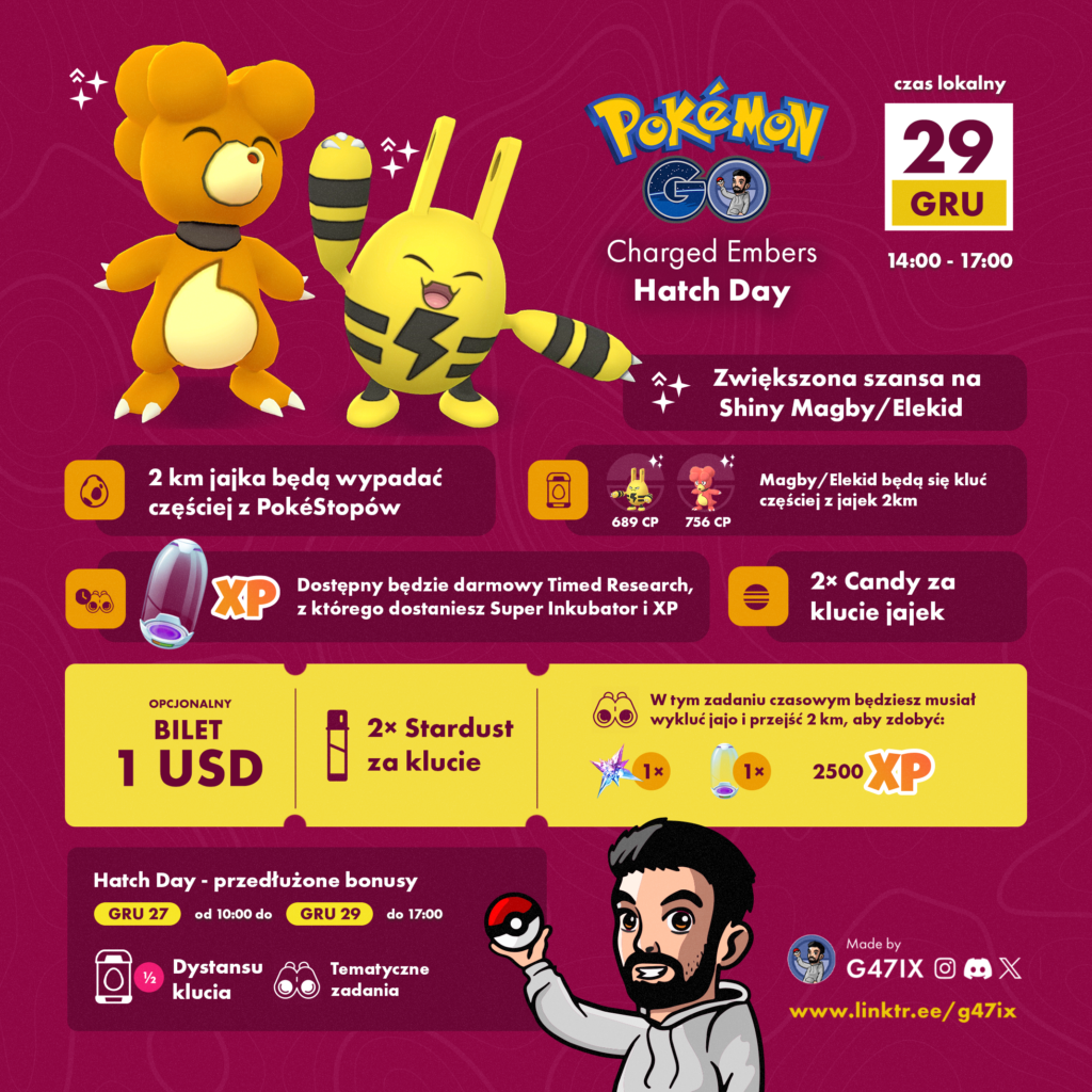 Charged Embers Hatch Day to doskonała okazja, aby zdobyć Elekida i Magby w ich błyszczących wersjach, a także zyskać sporo cukierków i innych nagród. Warto przygotować się na to wydarzenie wcześniej, wykorzystując bonus skróconego dystansu wykluwania jaj. Nie przegapcie tej szansy i ruszcie w teren, aby wykluć jak najwięcej Pokémonów!