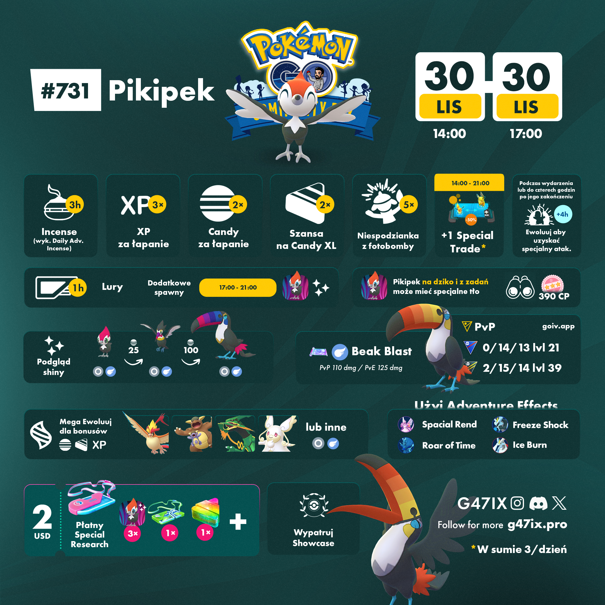 Podczas listopadowego Community Day Pikipek będzie pojawiać się częściej na dziko, a jeśli dopisze Wam szczęście – możecie spotkać jego Shiny formę lub wersję ze specjalnym tłem sezonowym „Tales of Transformation”.
