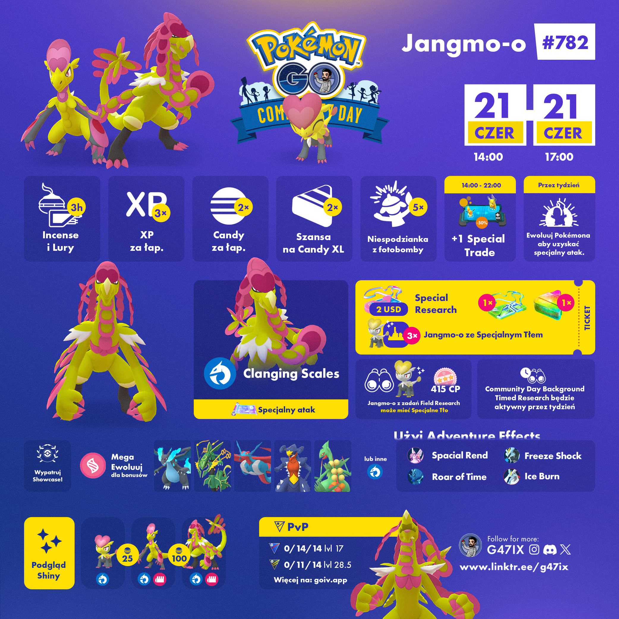 To jednak nie koniec atrakcji! Jeśli w trakcie wydarzenia lub do godziny 22:00 tego samego dnia ewoluuje się Jangmo-o przez Hakamo-o w Kommo-o, otrzymany Pokémon będzie znał ekskluzywny atak ładowany Clanging Scales. Atak ten zadaje 120 punktów obrażeń zarówno w walkach trenerów, jak i w Gymach oraz raidach. W przypadku PvP dodatkowo obniża obronę przeciwnika o jeden poziom.