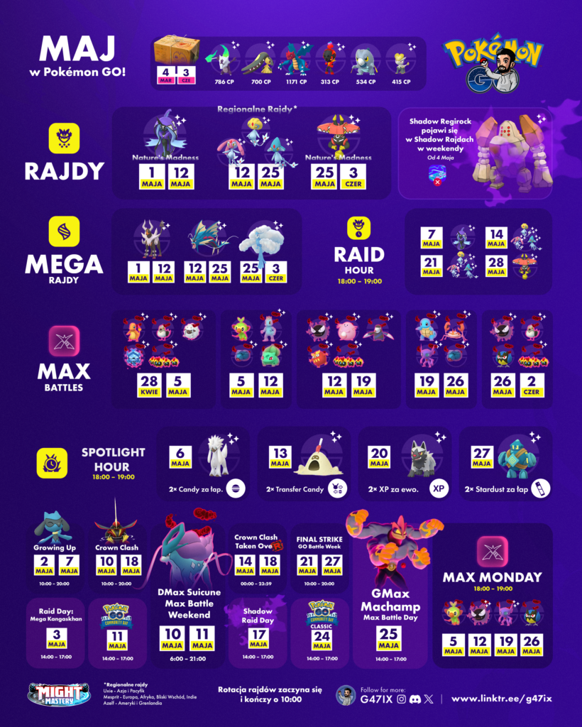 Trenerzy, maj zapowiada się ekscytująco! W nadchodzącym miesiącu w Pokémon GO czeka na nas mnóstwo atrakcji – zadebiutuje Gigantamax Machamp, powraca Mega Kangaskhan, a do raidów wracają legendarni Uxie, Mesprit i Azelf. Pojawią się też kolejne Dynamax Pokémony, nowe Spotlight Hours, Community Days i specjalne wydarzenia. Oto pełne zestawienie majowych aktywności w grze!