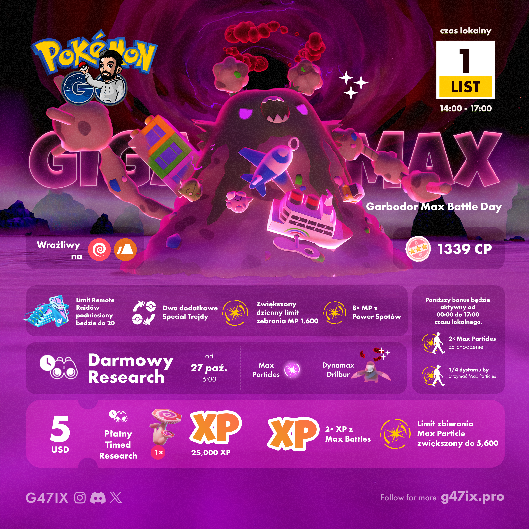 Podczas wydarzenia po raz pierwszy w Pokémon GO pojawi się Gigantamax Garbodor, dostępny w sześciogwiazdkowych MaksBitwach!