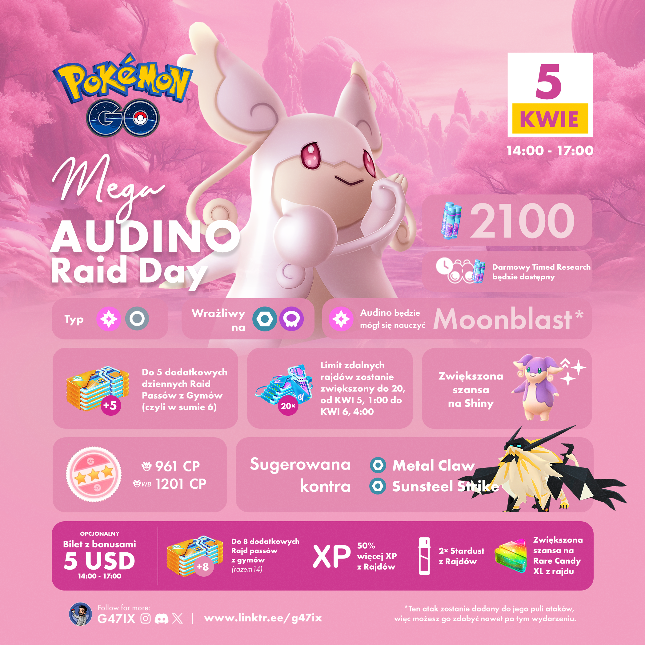Nie przegapcie tej wyjątkowej okazji na zdobycie Mega Audino i skorzystanie z licznych bonusów! Przygotujcie swoje drużyny i do zobaczenia w rajdach!