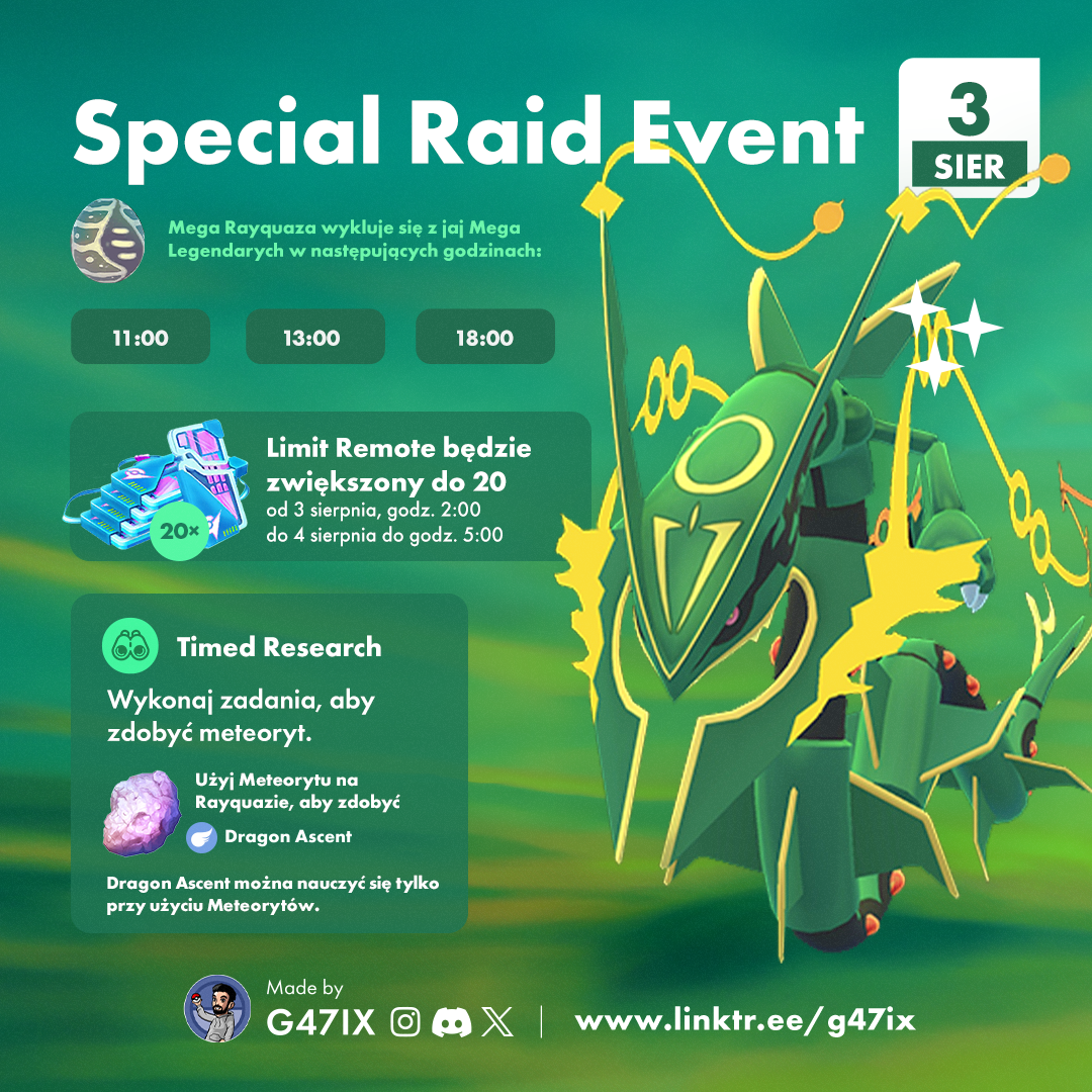Ze względu na problemy techniczne związane z pojawieniem się Mega Rayquazy w czerwcu, 3 sierpnia odbędzie się dodatkowy Rayquaza Raid Day. Tym razem jednak rajdy NIE będą rajdami elitarnymi, a zwykłymi rajdami Mega Legendarnymi, w których będzie można wziąc udział za pomocą Remote Raid Pass.