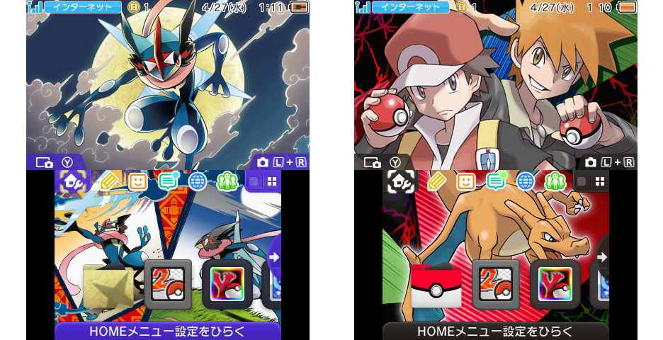 Dwa nowe motywy do swoich konsol Nintendo 3DS mogą zakupić Japończycy. Pierwszy z nich to Pokémon Red & Green. Na górnym ekranie znajduje się artwork Reda i Greena, a na dolnym ostatnie ewolucje starterów z Kanto (Venusaur, Charizad, Blastoise). W tle gra muzyka znana nam z gier Pokémon Red/Blue podczas walki z rywalem.