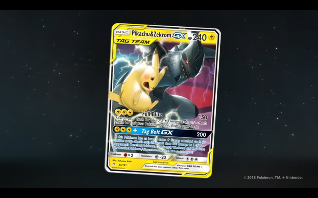 Zaanonsowana podczas turnieju o Mistrzostwo Świata Pokémon 2018 gra TAG TEAM Pokémon-GX wprowadza nową, dynamicznej i pełnej ekscytujących walk rozgrywkę, w której wygrana wymaga wysokiego ryzyka. Karty te oferują nieprzeciętną moc oraz punkty życia (HP) pozwalając, by pojedynczy atak niektórych TAG TEAM GX unieszkodliwiał należącego do oponenta Pokémona-GX. Jeśli dojdzie do unieszkodliwienia TAG TEAM, może to jednak skutkować otrzymaniem przez oponenta trzech kart Prize.