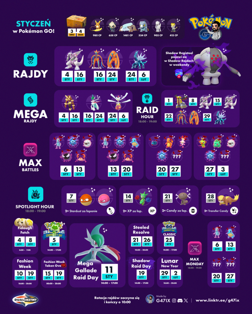- Mega Gallade Raid Day (11 stycznia, 14:00–17:00): Specjalne raidy z Mega Gallade w roli głównej.