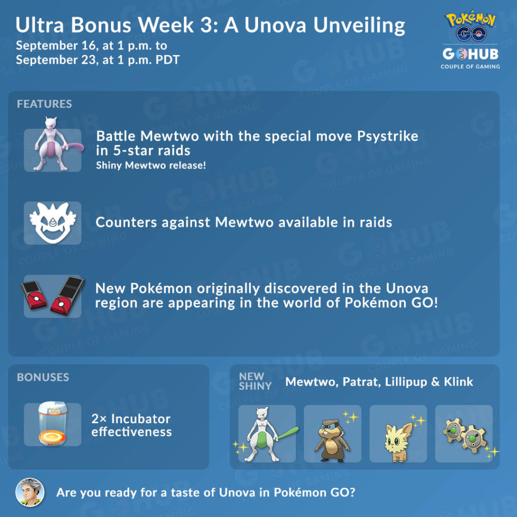 Ostatni, trzeci tydzień Ultra bonusów zacznie się 16 września o 22:00 i potrwa do 23 września do tej samej godziny. W tym czasie zadebiutują pierwsze Pokémony z piątej generacji – na pewno będą to Patrat, Lillipup i Klink – od razu te dwa pierwsze bedą możliwe do złapania w wersji shiny.