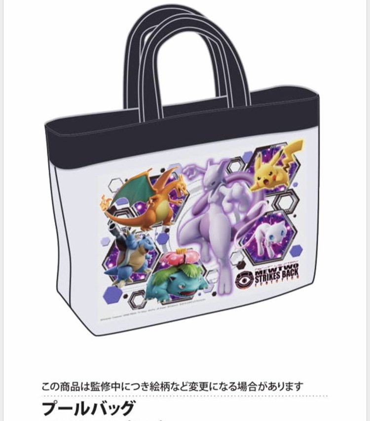 Pierwszym z produktów jest D-Bag, plecak, który Ash Ketchum ma w filmie. Kosztuje on 3300 jenów. Następna jest torba z wizerunkami Mewtwo, Pikachu, Mew, Charizarda, Blastoise’a i Venusaura. Trzecia jest torba na sznurku przedstawiająca z przodu Mewtwo, a z tyłu Mew, Pikachu, Charizarda, Venusaura i Blastoise’a. Ostatnia torba jest na szyję, a ukazuje Mewtwo.