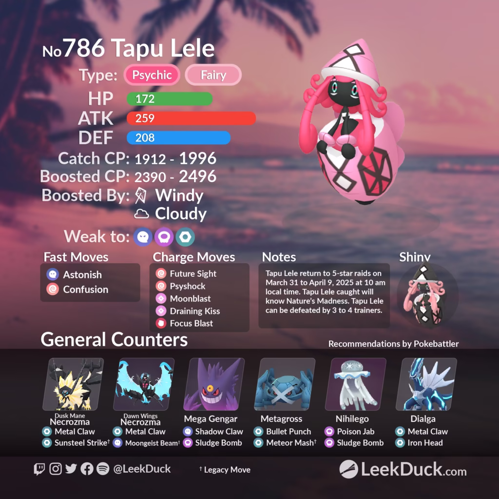 Tapu Lele, legendarny Pokémon typu Psychic / Fairy, powraca do raidów w Pokémon GO! Jeśli chcesz zdobyć go do swojej kolekcji, a może nawet trafić na jego wersję shiny, musisz dobrze się przygotować. W tym poradniku znajdziesz najlepsze kontry, informacje o CP i wskazówki, jak efektywnie pokonać tego wymagającego przeciwnika.