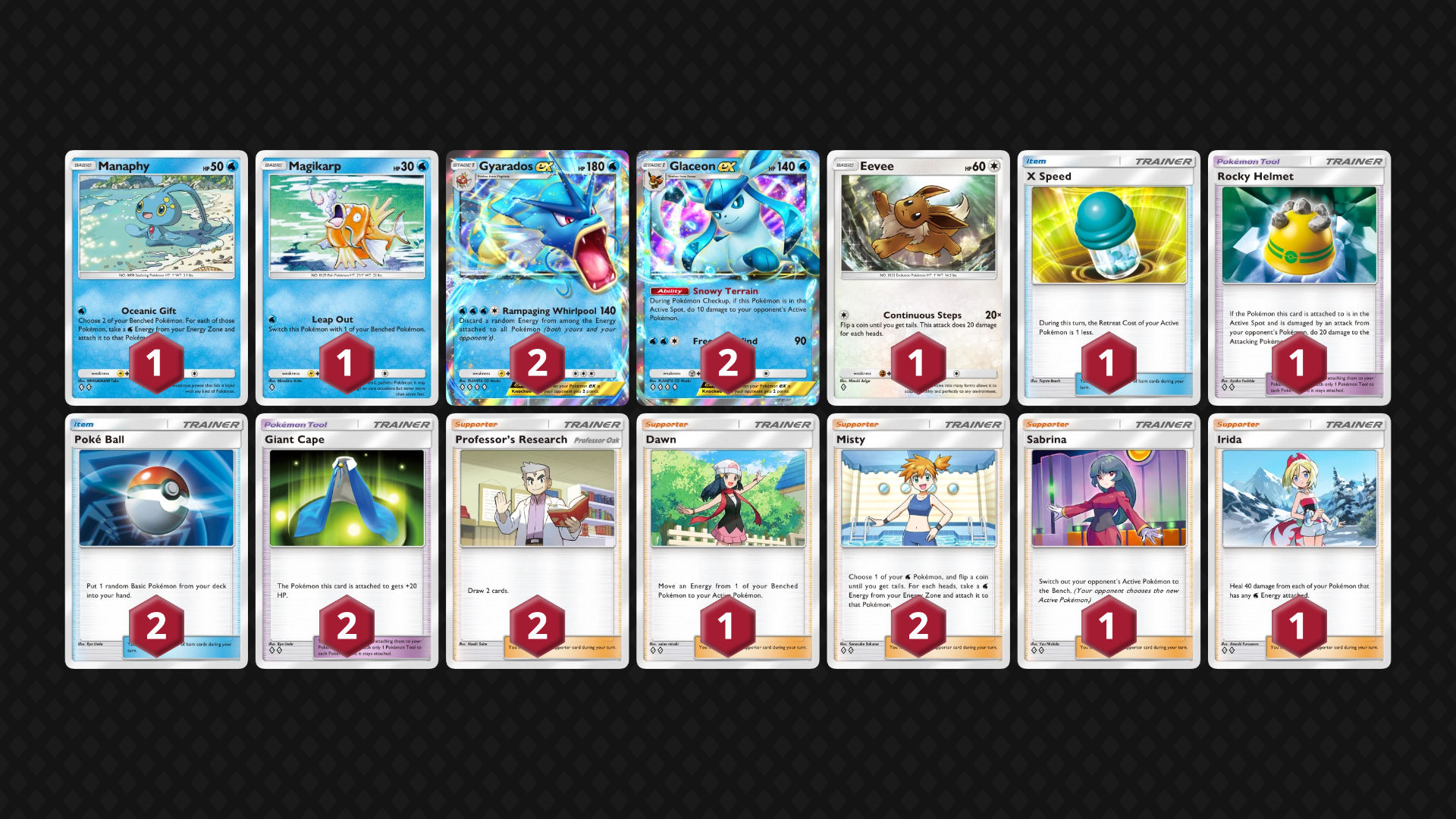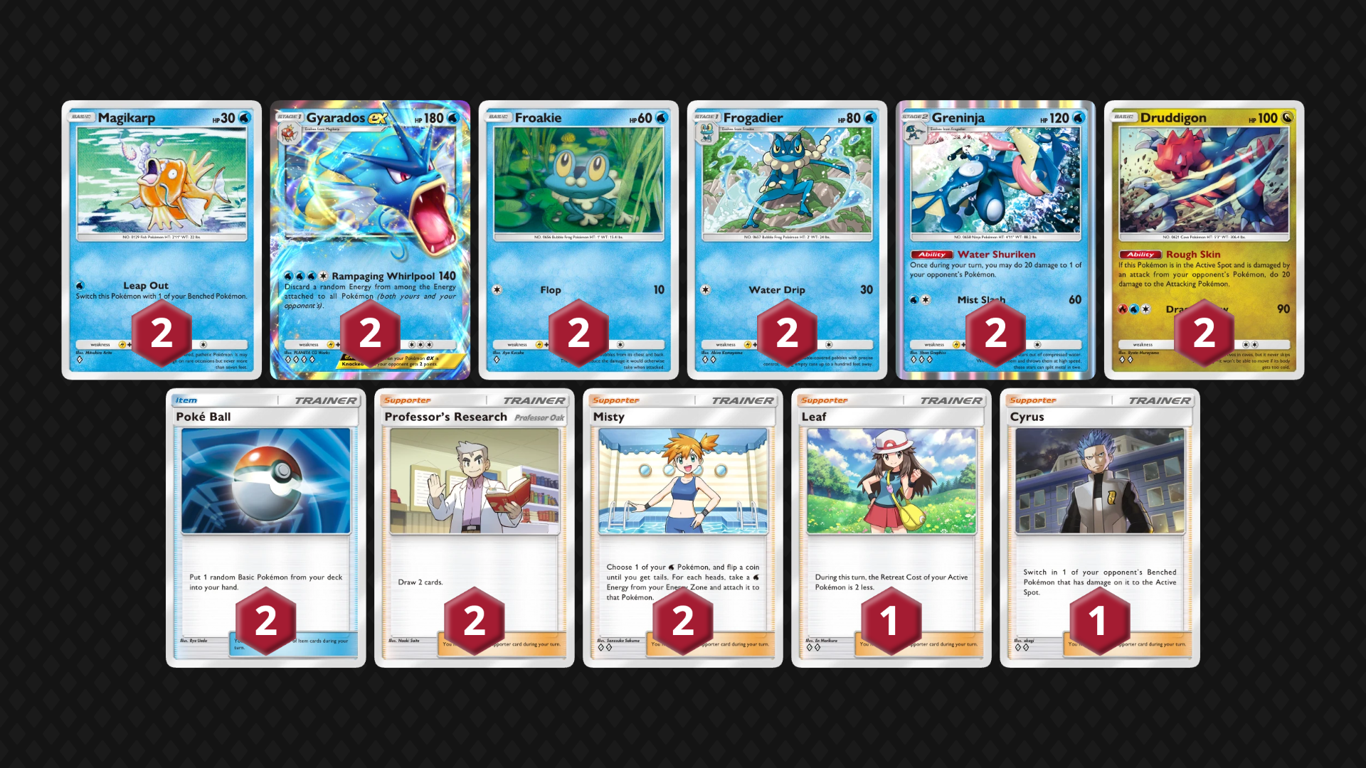 Wodna talia, której główną siłą jest Gyarados ex i jego potężny atak Rampaging Whirlpool. Greninja z ławki pozwala na dodatkowe obrażenia w każdej turze, a Druddigon idealnie tankuje, odbija ataki przeciwnika i pozwala naładować wodne działa.