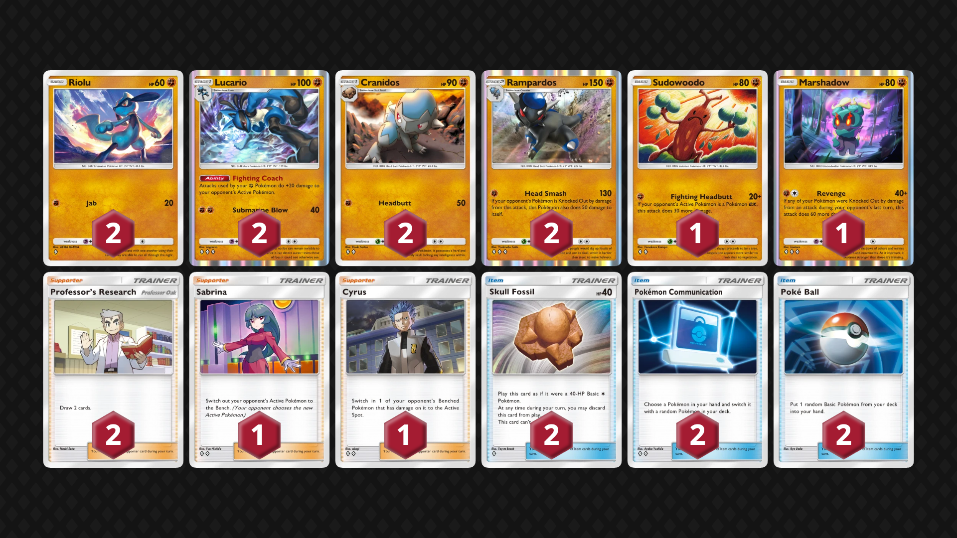 To agresywna talia Fighting, której główną siłą jest Lucario i jego zdolność Fighting Coach, zwiększająca obrażenia ataków sojuszników. Rampardos może znokautować większość przeciwników jednym atakiem Head Smash (130 DMG), ale uważaj – otrzymuje wtedy obrażenia zwrotne.