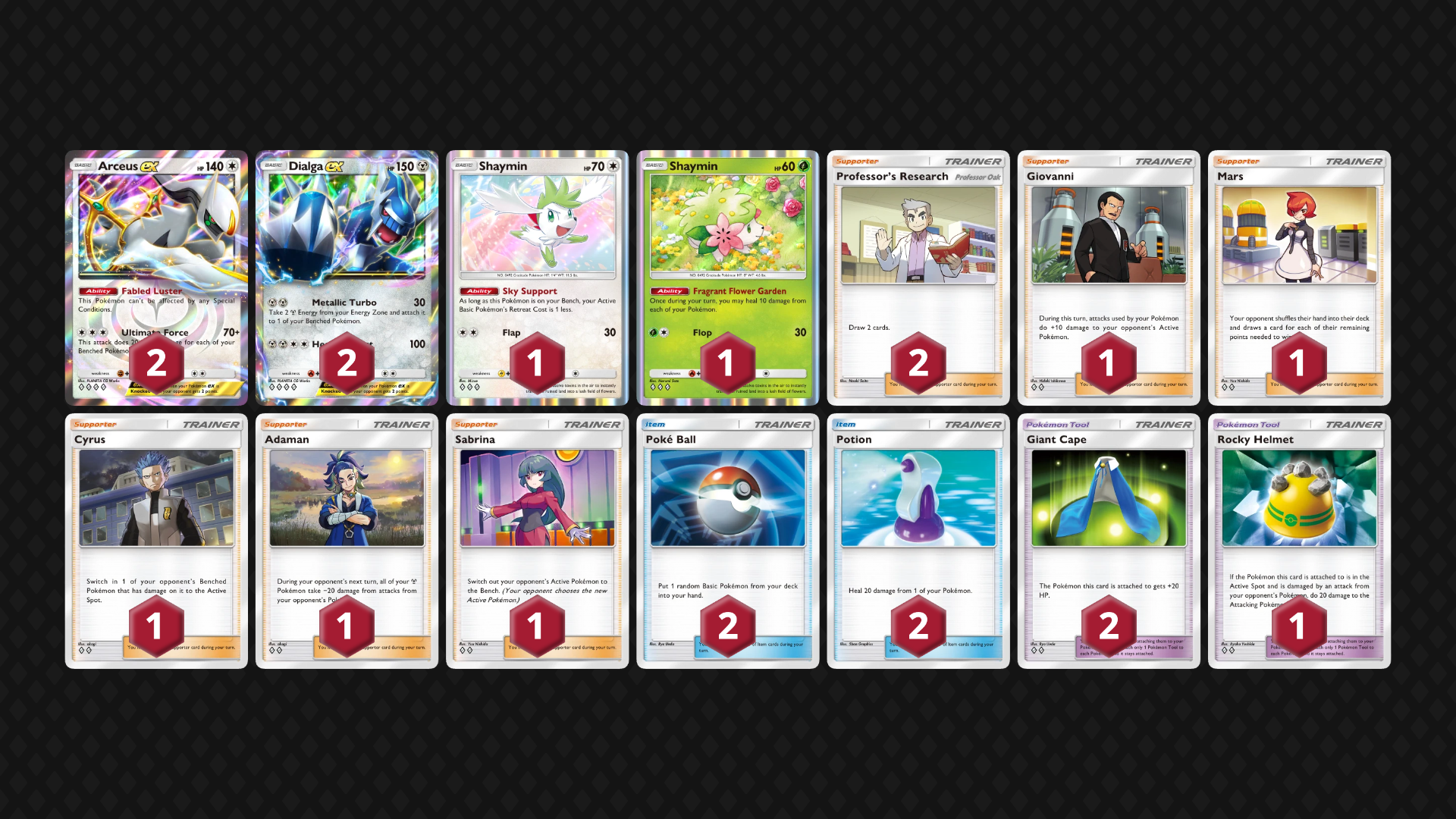 Talia skupia się na Arceusie ex i Dialdze ex, które pozwalają na szybkie ładowanie energii i długotrwałą kontrolę meczu. Arceus ex jest odporny na Special Conditions, co czyni go wyjątkowo trudnym do pokonania, a ponadto dysponuje potężnymi obrażeniami.